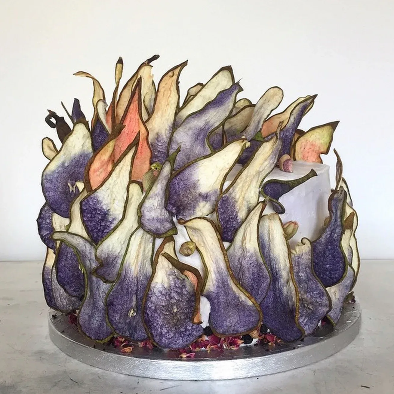 But edible they necessarily are. ‘My focus has always been that [the cakes] have to taste great as well, and you have to be able to eat everything’, Helen explains. ‘I started colouring [dehydrated fruit] naturally. The fruit looked like petals and looked beautiful as a decorative, edible thing. I experimented with those and how they could be moulded and twinned […] I’m always fiddling around with things to create different textures.’
